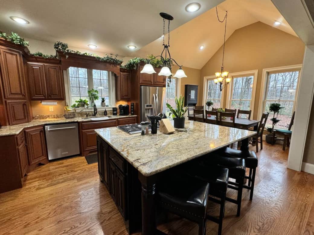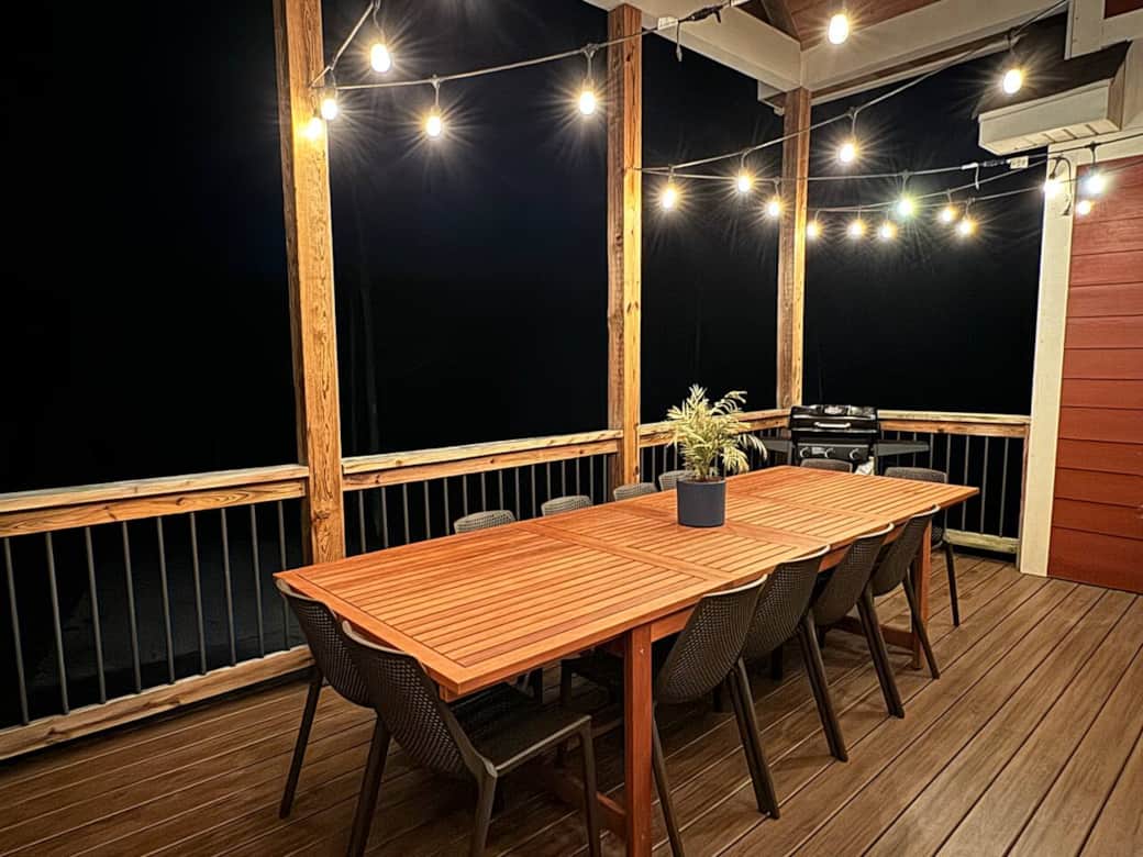 This dining room accommodates 10 people comfortably, with another 4 at the island, plus 12 on the deck!